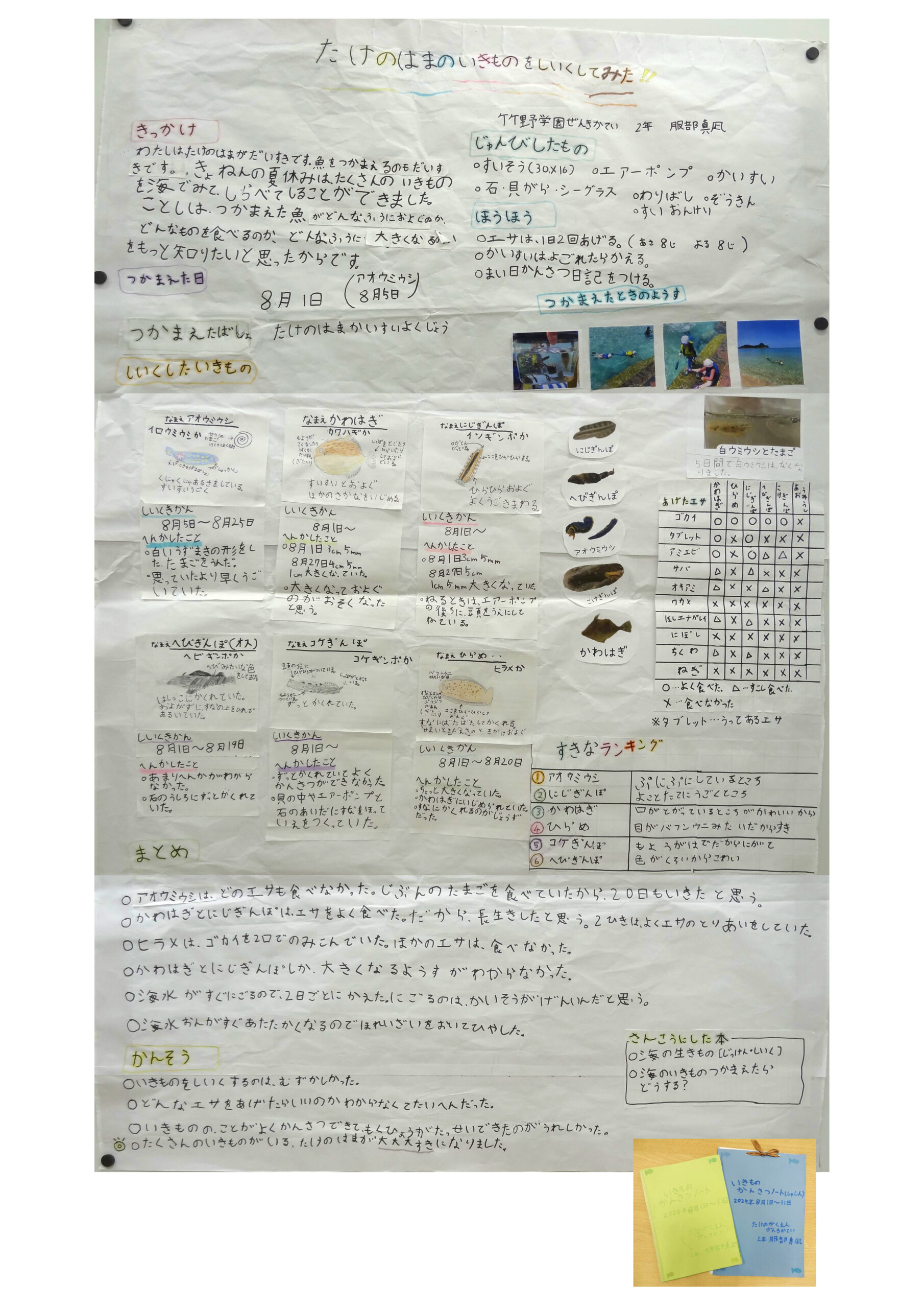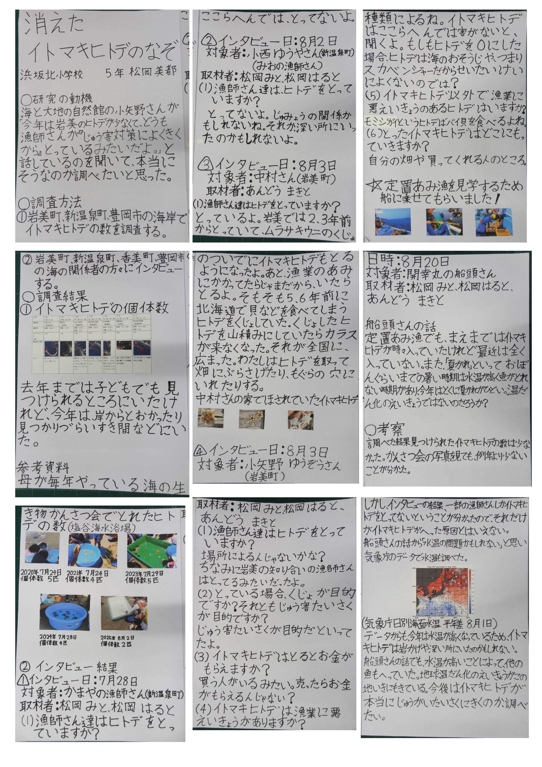 イトマキヒトデが少なくなっていることを聞いて、疑問に思い、岩美町、新温泉町、香美町、豊岡市など複数の場所で漁師さんたちにインタビューしている姿が大変素晴らしいです。インタビューの結果、一部の漁師さんしかイトマキヒトデをとっていないことに気づき、新たな疑問を生みました。疑問を解決するために行動し、そこから新たな疑問を生み出す活動は、研究するうえでとても重要な姿勢です。自ら現地に足を運び、情報を集めることで、より深い理解につながります。今後もこのように、身近な自然や社会の変化に目を向け、粘り強く探究を続けていってほしいと思います。