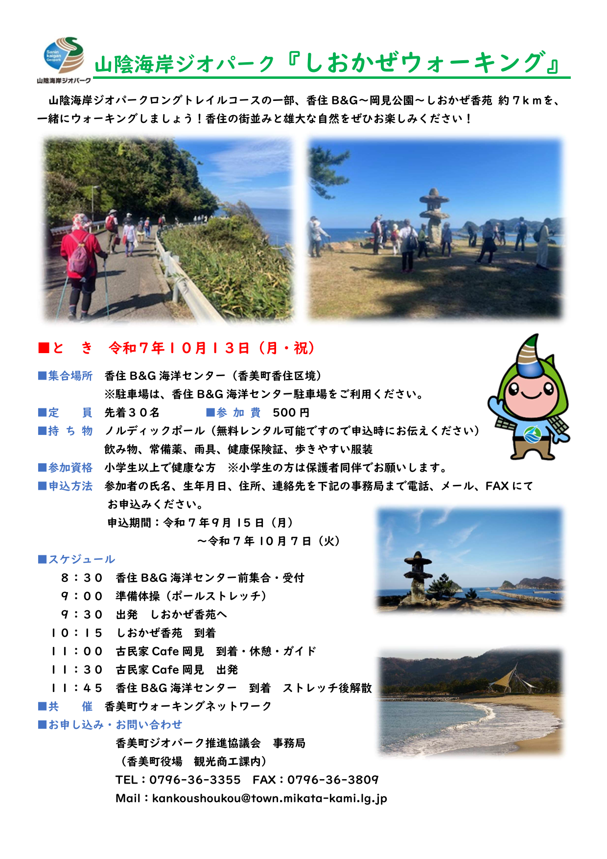 香住B&G海洋センター~しおかぜ香苑~岡見公園のジオパークロングトレイルコースの一部約7kmをジオパークガイドとともに歩くウォーキングイベントです。