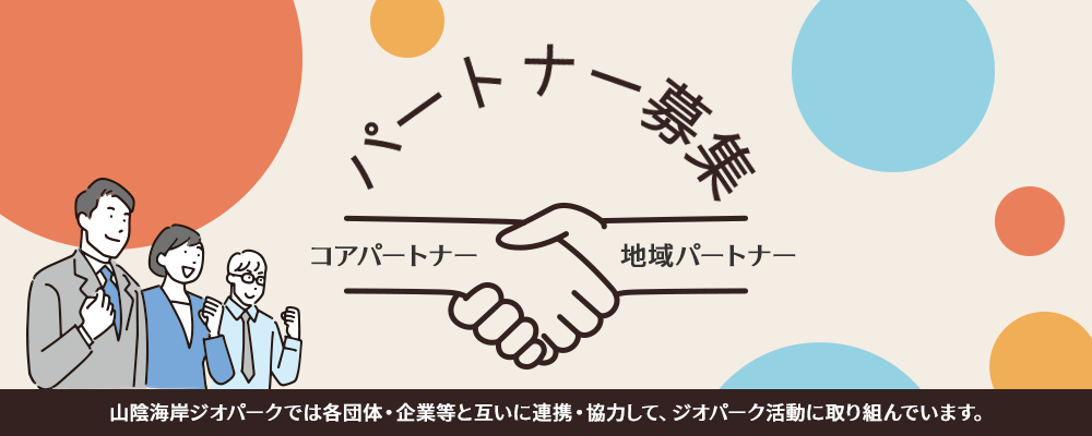 山陰海岸ジオパーク推進協議会では、地域の自然・文化・暮らしを守り育てる活動をともに推進する「パートナー」を募集しています。 企業・大学・自治体などの【コアパートナー】、地元事業者・民宿・法人などの【地域パートナー】として、ジオパークの理念に共感し、活動に参加いただける皆さまのご登録をお待ちしています。