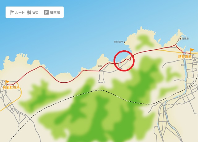 コース12(居組駐在所~諸寄漁港)について、新温泉町釜屋の釜屋橋付近の工事のため、令和7年10月17日(金)から12月25日(木)【予定】まで、一部区間が全面通行止めとなっています。