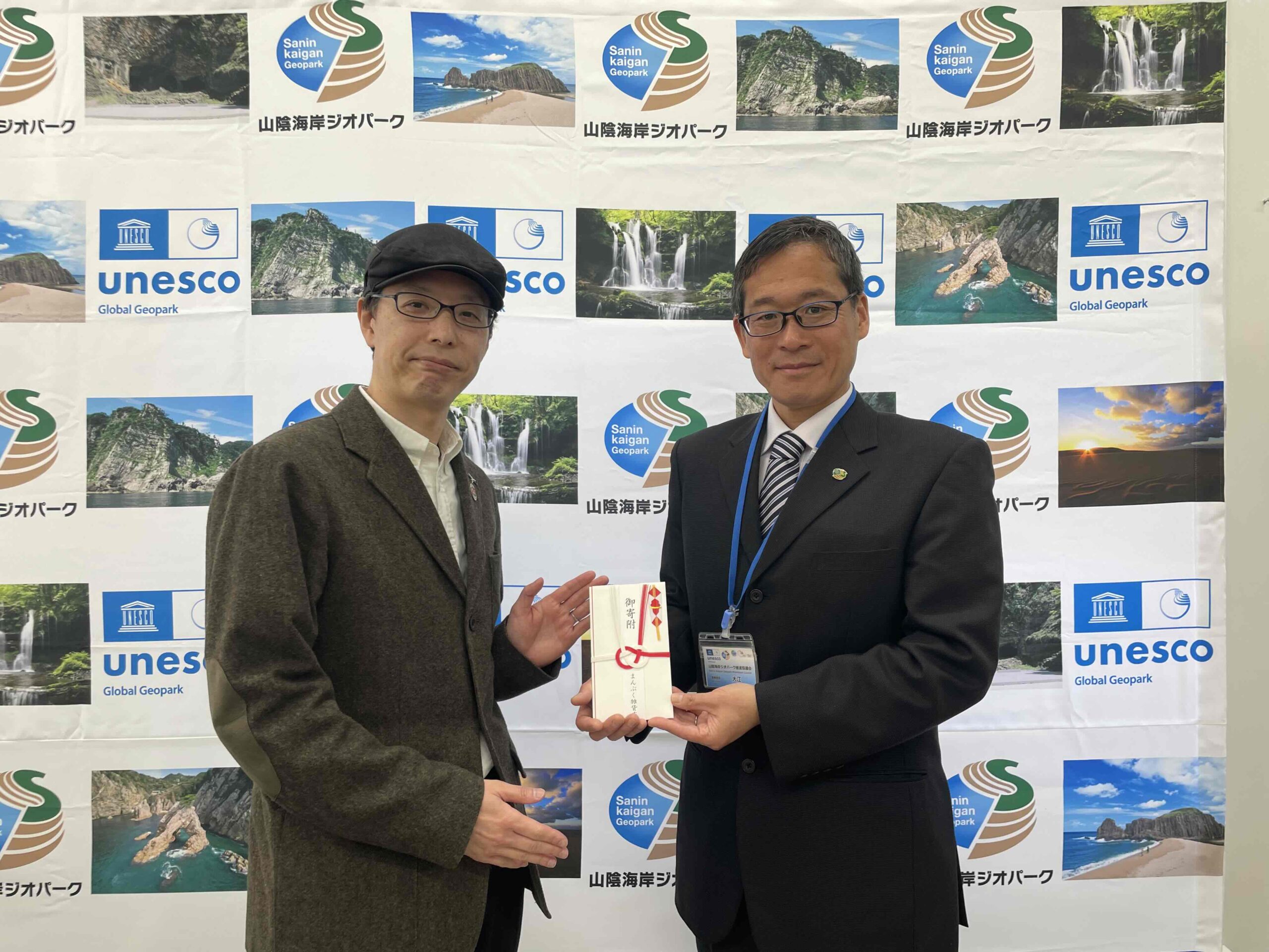2月24日(火曜日)、山陰海岸ジオパーク公認のロゴマーク商品(ハタハタのしおり、ボイルホタルイカのフレークシール)を販売されているMarksplan様から、昨年に引き続き、山陰海岸ジオパーク推進協議会に売上の一部をご寄附いただきました。